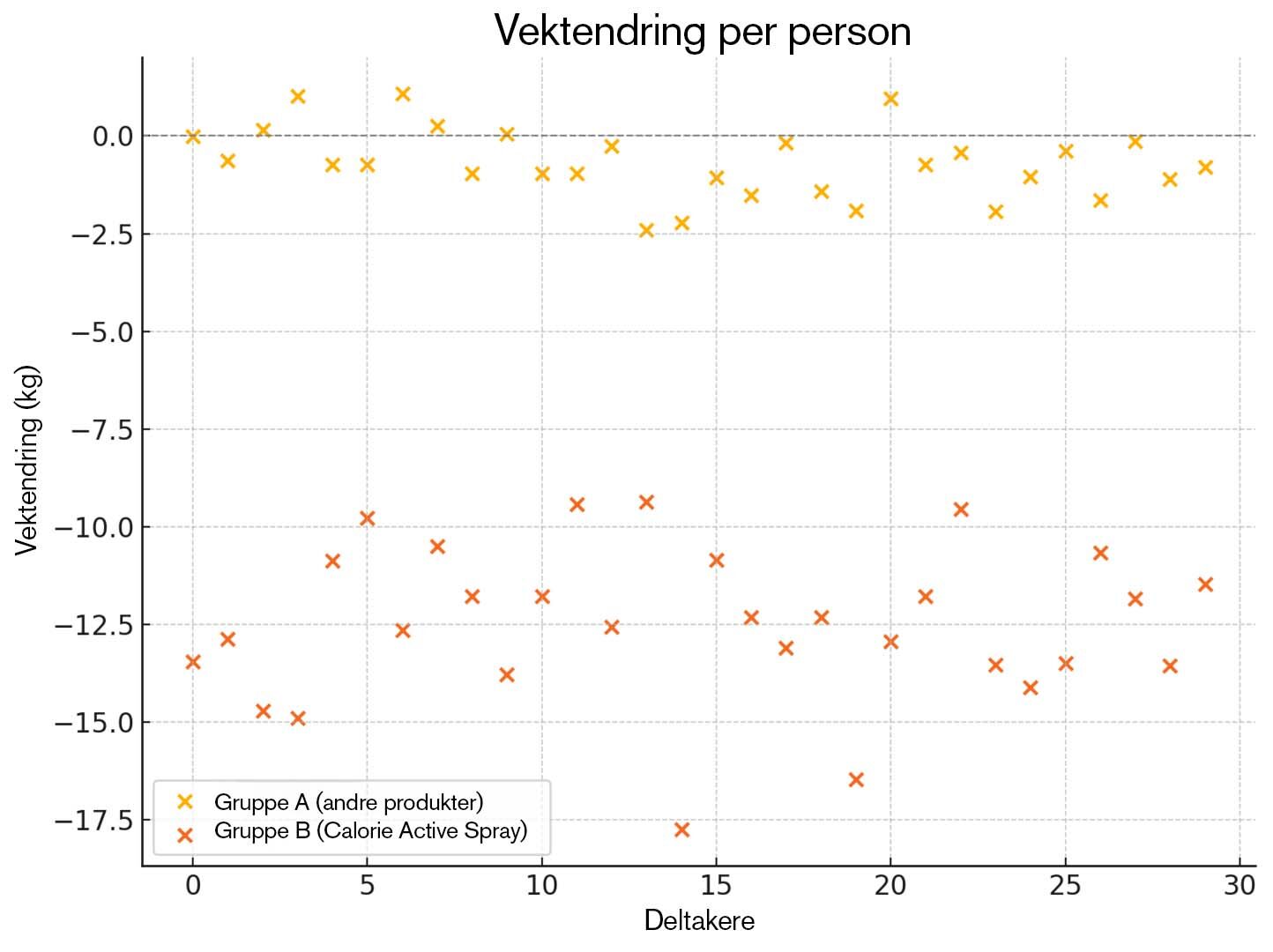 Alle deltakerne i testgruppe B (Calorie Active Spray) klarte å gå ned i vekt.
